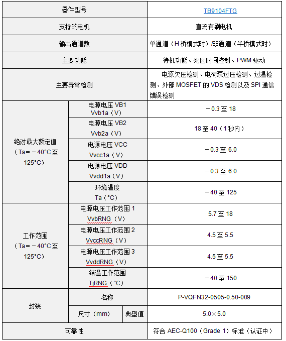 TB9104FTG采用5.0mm×5.0mm(典型值)的小型VQFN32封裝。封裝底部的裸露散熱焊盤可以有效提升散熱性能,通過(guò)與外部MOSFET配合使用,可實(shí)現(xiàn)緊湊的驅(qū)動(dòng)電路,適用于車身系統(tǒng)應(yīng)用中的大電流直流有刷電機(jī)。