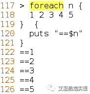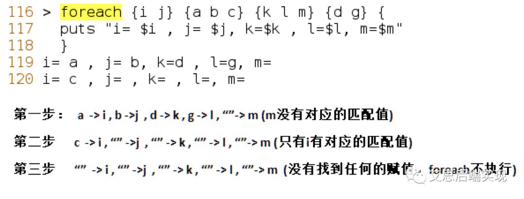 仔細看下面的這個示例,foreach把列表變量{I j}和{k l m},先展開成為獨立的變量,而后盡量與后面的列表完成一一匹配,目標(biāo)是打印完所有的賦值后,結(jié)束foreach,這里的示例如下: