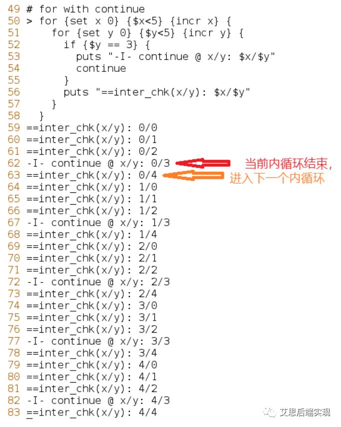 細心的讀者,可以從第62、63行可以看出continue的命令運行方式了吧:當(dāng)前循環(huán)立刻結(jié)束,立刻啟動下次循環(huán)。