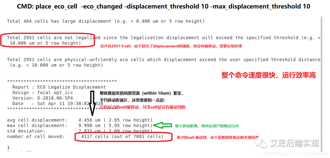 可以看到,這里有30871個(gè)cell的位置被改變,ECO的cell其實(shí)只有7081個(gè)cell??梢?jiàn)大約有23K個(gè)cell的移動(dòng),是為了來(lái)給ECO cell騰挪空間的。 - CMD: place_eco_cell -eco_changed -displacement_threshold 10 -max_displacement_threshold 10