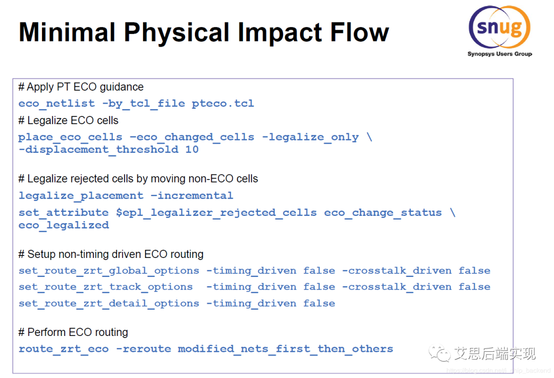 這里的關(guān)鍵節(jié)點(diǎn)是在,placement/legalization,任何器件的位置變動(dòng)帶來(lái)的意外的影響都有可能導(dǎo)致ECO無(wú)法按照期望方向進(jìn)行,這是因?yàn)?,原有?shù)據(jù)庫(kù)的cell的放置被調(diào)整,之前的繞線需要做相應(yīng)的調(diào)整,同時(shí)帶來(lái)更多的timing/驅(qū)動(dòng)能力的問(wèn)題,這樣就會(huì)給數(shù)據(jù)庫(kù)帶來(lái)不期望的抖動(dòng)。為了盡可能保證原有數(shù)據(jù)庫(kù)的狀態(tài),這里需要引入一個(gè)新名詞:Minimal Physical Impact Flow(MPI):