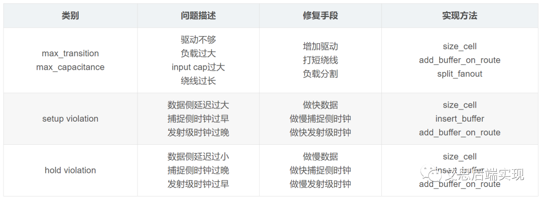 在實(shí)際的ECO中,版圖的實(shí)現(xiàn)是非常重要的步驟。是否能完成STA的腳本期望,是數(shù)據(jù)庫(kù)能否走向收斂的關(guān)鍵點(diǎn)。一般的STA對(duì)應(yīng)的ECO和相應(yīng)的修復(fù)方法如下: