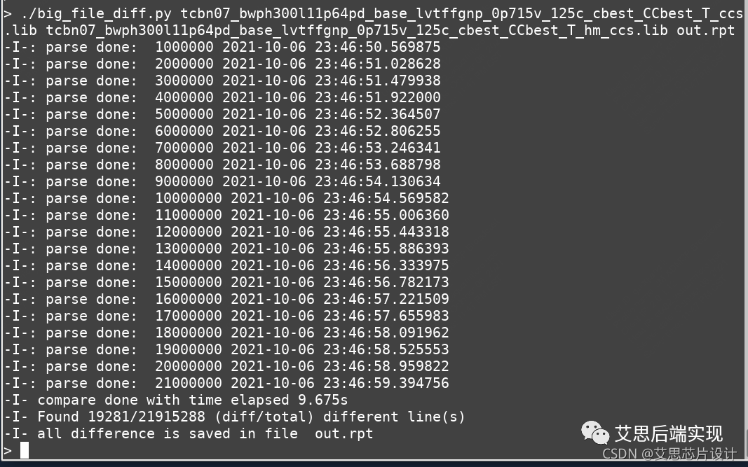 從以上截圖可以看到,使用python進(jìn)行文件比對,基本在10秒內(nèi)可以完成兩個1.6G文件的比對,其中共找到了19K+的不同行,不同之處可以方便的導(dǎo)出到out.rpt里邊??匆幌抡w行數(shù):