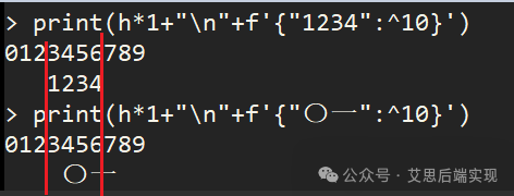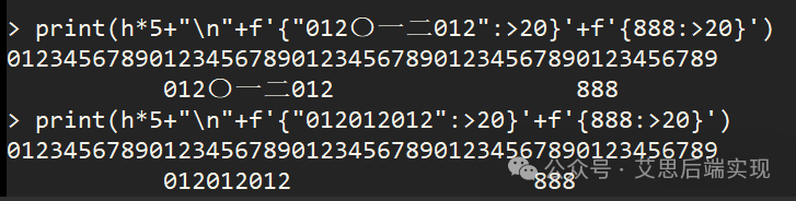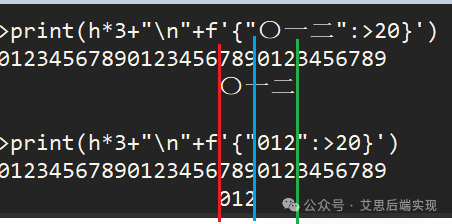 這個(gè)是一個(gè)右對(duì)齊的示例,print函數(shù)首先計(jì)算了打印對(duì)象的長(zhǎng)度len(),得到了這個(gè)打印對(duì)象的長(zhǎng)度為3(此處忽略全角和半角),所以print會(huì)從右對(duì)齊的20節(jié)點(diǎn)開(kāi)始排布,意即print把從第18 個(gè)字符的位置開(kāi)始打印,這里用紅線表示,所以無(wú)論全角還是半角對(duì)象,print都會(huì)從第18 個(gè)字符的位置打印。
