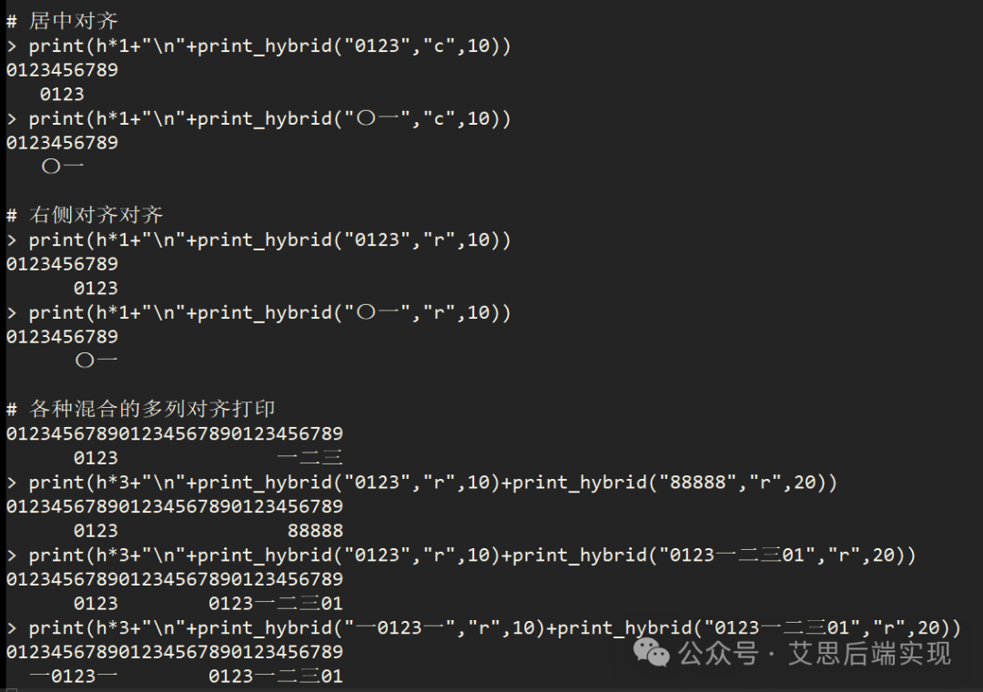 可見(jiàn),此種方法建立在print原生的打印機(jī)制,輔助計(jì)算全角字符的數(shù)量的方法,實(shí)現(xiàn)的了全半角混合打印的對(duì)齊效果。
