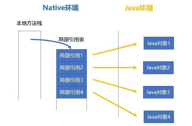 注意:局部引用不是我們平時(shí)所理解的代碼中的局部變量,局部變量在當(dāng)前生命周期(例如函數(shù)退出)結(jié)束后就會失效,而局部引用在函數(shù)退出后可能不會失效,它的生命周期是和整個(gè)Native上下文環(huán)境相關(guān)聯(lián),只有從Native環(huán)境返回到Java環(huán)境后局部引用才會失效。