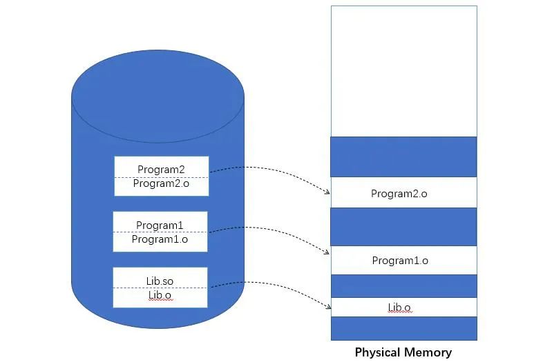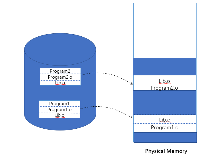 Program1和Program2分別包含Program1.o和Program2.o兩個(gè)模塊,他們都需要Lib.o模塊。靜態(tài)鏈接情況下,兩個(gè)目標(biāo)文件都用到Lib.o這個(gè)模塊,所以它們同時(shí)在鏈接輸出的可執(zhí)行文件Program1和program2中有副本,同時(shí)運(yùn)行時(shí),Lib.o在磁盤(pán)和內(nèi)存中有兩份副本,當(dāng)系統(tǒng)中有大量類(lèi)似Lib.o的多個(gè)程序共享目標(biāo)文件時(shí),就會(huì)浪費(fèi)很大空間。