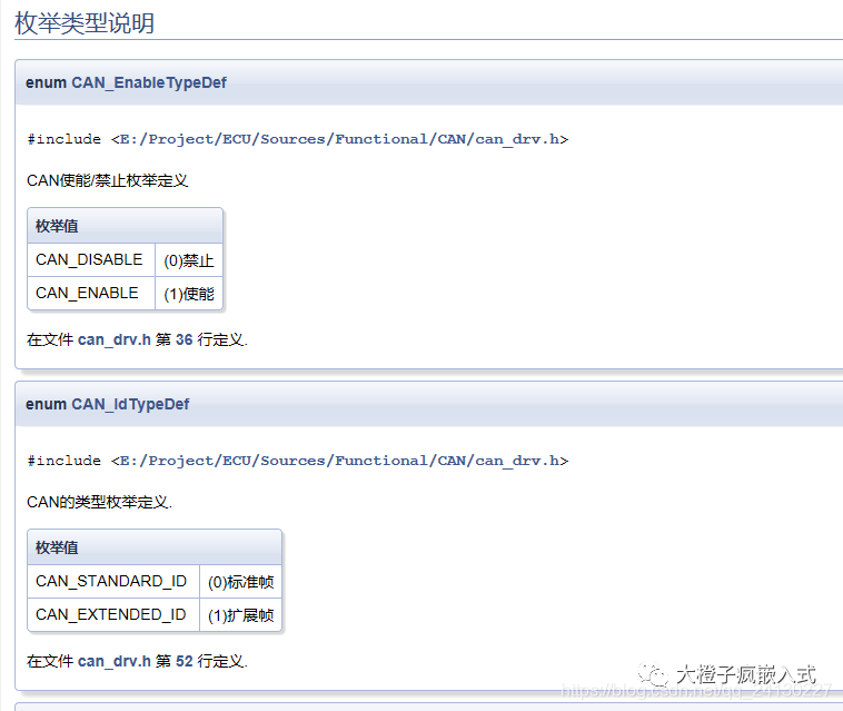 /** * @brief CAN使能/禁止枚舉定義 */typedef enum{ CAN_DISABLE = 0, /*!< (0)禁止 */ CAN_ENABLE = !CAN_DISABLE/*!< (1)使能 */}CAN_EnableTypeDef; /** * @brief CAN幀的格式枚舉定義. */typedef enum { CAN_DATA_FRAME = 0, /*!< (0)數(shù)據(jù)幀 */ CAN_REMOTE_FRAME /*!< (1)遠(yuǎn)程幀 */} CAN_RtrTypeDef;