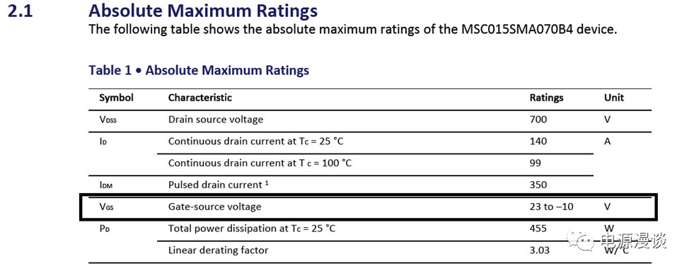 ? ? ? ?對(duì)于額定最大電壓,它是加在門(mén)級(jí)電壓的允許的最大值,在任何情況下都不能超過(guò)這個(gè)值,否則可能會(huì)損壞器件,這個(gè)規(guī)格主要是考慮有一些門(mén)級(jí)電壓尖峰或者噪聲,或者基于寄生參數(shù)及layout因素導(dǎo)致的一些門(mén)級(jí)瞬態(tài)電壓。此處我們以MSC015SMA070B4這個(gè)700V耐壓,15mohm導(dǎo)通阻抗的碳化硅MOSFET來(lái)說(shuō)明一下,如圖5.所示。此處,我們可以看到這個(gè)器件允許的門(mén)級(jí)最大正電壓為23V,和最大負(fù)電壓為-10V.