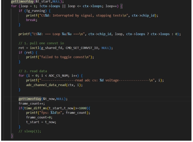 好了,接著看測(cè)試邏輯 發(fā)送一次 CMD_SET_CONVST_IO 后,開(kāi)始讀取每個(gè)通道的值