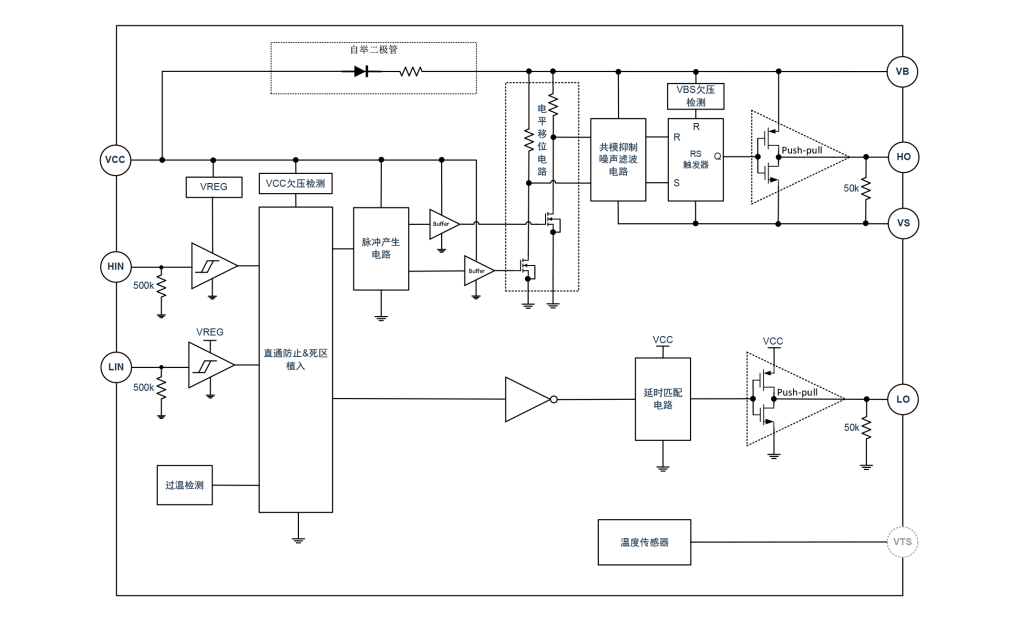 該系列產(chǎn)品內(nèi)置多重保護功能,如VCC/VBS欠壓保護、過溫保護、直通防止功能以及內(nèi)置400ns死區(qū)時間,可有效保護功率器件穩(wěn)定運行。