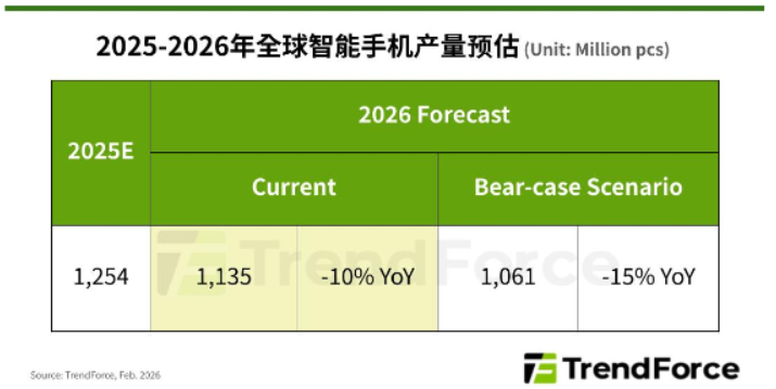 Feb. 11, 2026 ---- 根據(jù)TrendForce集邦咨詢最新智能手機(jī)研究,2026年全球手機(jī)生產(chǎn)表現(xiàn)受存儲(chǔ)器價(jià)格高漲影響,恐呈現(xiàn)10%的年衰退,總量約降至11.35億支。然而,存儲(chǔ)器漲勢(shì)未歇,加劇終端售價(jià)與消費(fèi)者期望之間的差距,恐導(dǎo)致終端需求更加疲弱。因此,TrendForce集邦咨詢進(jìn)一步預(yù)測(cè)在悲觀情境(bear-case scenario)下,今年全球手機(jī)生產(chǎn)年減幅度將擴(kuò)大至15%或更高;各品牌因產(chǎn)品結(jié)構(gòu)、區(qū)域布局不同,受沖擊程度也將有所差異。