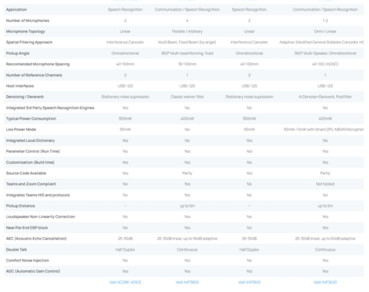 該語(yǔ)音方案選型指南涵蓋了XMOS全系列語(yǔ)音產(chǎn)品組合,設(shè)計(jì)旨在幫你更快速高效地做出科學(xué)選型決策。只需回答幾個(gè)簡(jiǎn)短問(wèn)題,如計(jì)劃使用的麥克風(fēng)數(shù)量、是否需要遠(yuǎn)場(chǎng)工作模式、所需的板載處理能力等,就能獲得量身定制的XMOS最優(yōu)語(yǔ)音方案推薦。同時(shí),XMOS還提供詳盡的對(duì)比表格,清晰呈現(xiàn)各方案的核心差異,讓你在進(jìn)行對(duì)比后安心地做出抉擇。