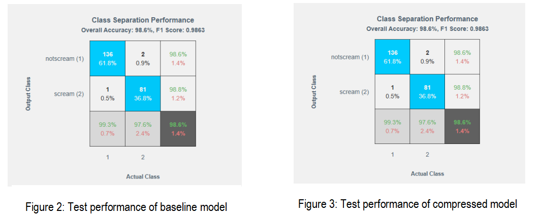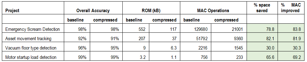 從這些實(shí)驗(yàn)結(jié)果可以看到,模型在壓縮后的準(zhǔn)確率基本得以保持。兩個(gè)項(xiàng)目在壓縮前后完全沒有精度損失(緊急尖叫檢測(cè):98% → 98%,電機(jī)啟動(dòng)負(fù)載:99% → 99%),其余兩個(gè)項(xiàng)目的變化也僅為1%的輕微下降(資產(chǎn)移動(dòng):92% → 91%,吸塵器地面類型:96% → 95%)。
