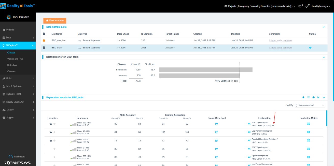 在AI Explore?頁面中訓(xùn)練模型,并探索不同的特征空間與決策結(jié)構(gòu)。點(diǎn)擊“Start Explore”后,系統(tǒng)會(huì)自動(dòng)訓(xùn)練和測(cè)試多種模型,并根據(jù)性能對(duì)它們進(jìn)行排序。在Explore的結(jié)果中,你會(huì)同時(shí)看到部分模型的基線版本與壓縮版本。當(dāng)某個(gè)基線模型在不降低準(zhǔn)確率的情況下可以進(jìn)一步縮小體積時(shí),工具會(huì)自動(dòng)生成其壓縮版本。壓縮模型會(huì)使用一個(gè)特殊符號(hào)標(biāo)記