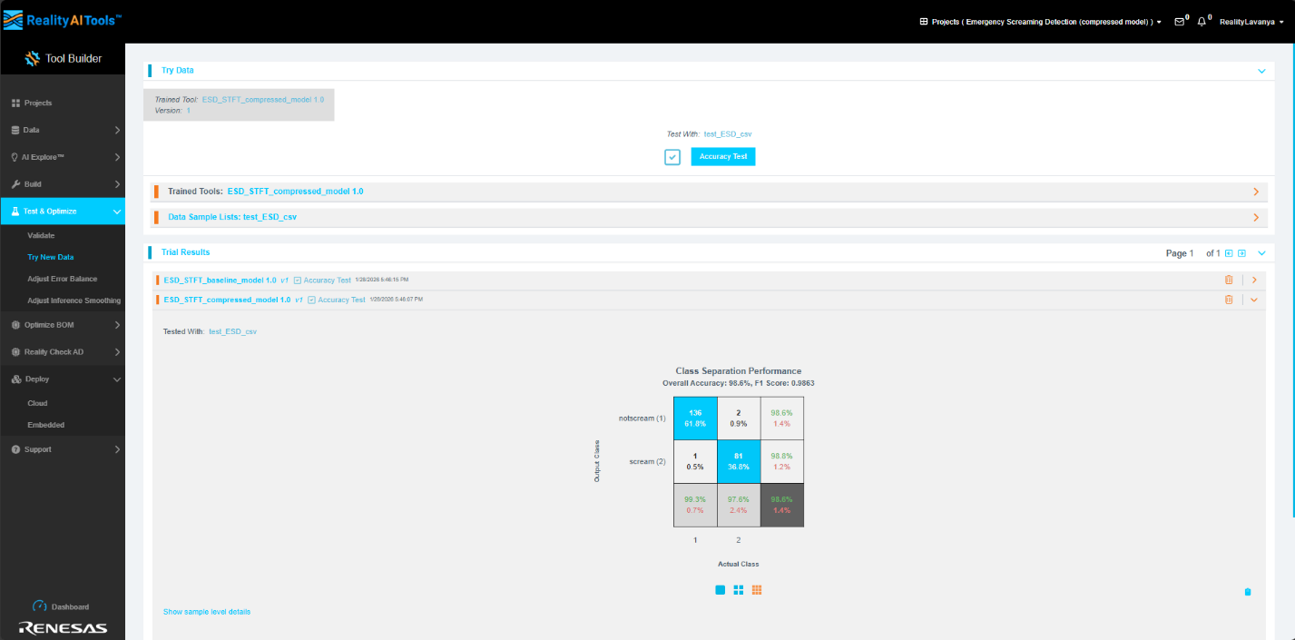 你可以在Test & Optimize→Try New Data區(qū)域測(cè)試壓縮后的模型。選擇壓縮版本的Trained Tool模型以及所需的測(cè)試數(shù)據(jù)集,然后運(yùn)行AccuracyTest(準(zhǔn)確率測(cè)試),即可評(píng)估該模型在未見過的數(shù)據(jù)上的表現(xiàn)。