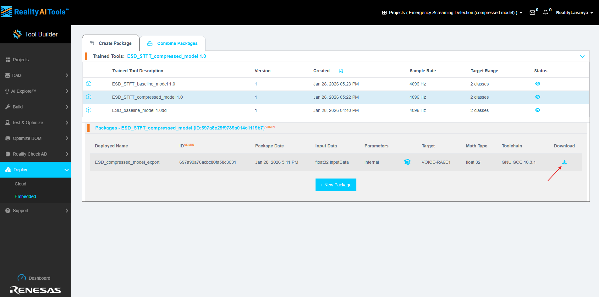 部署同樣非常簡(jiǎn)單。在驗(yàn)證壓縮模型并確認(rèn)其性能符合預(yù)期后,你可以進(jìn)入Deploy→Embedded完成部署流程。選擇已經(jīng)訓(xùn)練好的壓縮模型,并根據(jù)目標(biāo)嵌入式系統(tǒng)的約束條件創(chuàng)建新的部署包。隨后,下載生成的可導(dǎo)出模型包,并將其部署到目標(biāo)硬件板上。與Reality AI Tools®中其他模型的部署方式完全一致,使用壓縮模型無需任何額外步驟或特殊處理。