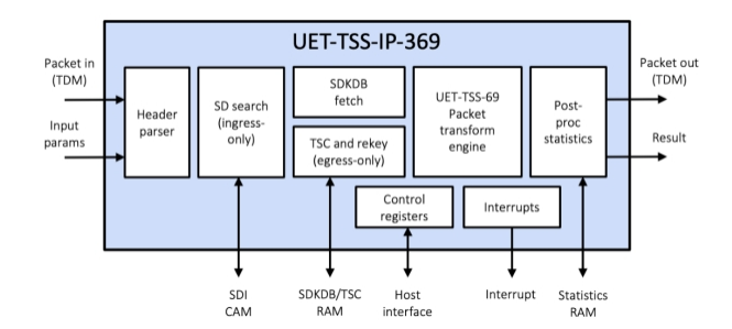 · UET-TSS-IP-369:一款高性能、多通道串聯(lián)數(shù)據(jù)包引擎,可提供完整的 TSS 層功能,速率高達(dá) 1.6Tbps。該產(chǎn)品內(nèi)置了 UET-TSS-IP-69 作為處理數(shù)據(jù)通路,并補(bǔ)充了分類(lèi)、SDKDB、密鑰管理及統(tǒng)計(jì)功能。
