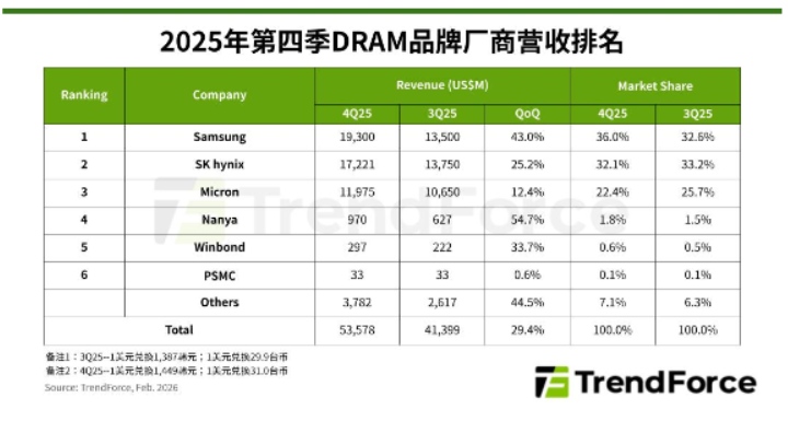 Feb. 26, 2026 ---- 根據(jù)TrendForce集邦咨詢最新調(diào)查顯示,由于AI應(yīng)用由LLM模型訓(xùn)練延伸至推理,推動(dòng)CSPs業(yè)者的數(shù)據(jù)中心建置重心由AI Server延伸至General Server,進(jìn)一步推動(dòng)存儲(chǔ)器采購(gòu)重心由HBM3e、LPDDR5X及大容量RDIMM延伸至各類容量的RDIMM,積極釋出追加訂單,帶動(dòng)Conventional DRAM的合約價(jià)大幅上漲,2025年第四季DRAM產(chǎn)業(yè)營(yíng)收為535.8億美元,較上季度增加29.4%。