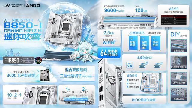 華碩ROG B850迷你吹雪主板采用10(90A)+2(90A)+1供電模組,全方位散熱解決方案,包括銀白一體式散熱裝甲、內(nèi)置VRM散熱風(fēng)扇和2盎司銅10層PCB等,高效冷靜,提供更好的性能體驗(yàn)。支持AI智能超頻、混合雙模超頻、AI緩存加速引擎以及AI智能網(wǎng)絡(luò)2.0,全方位優(yōu)化系統(tǒng),讓整機(jī)更聰明。AEMP可充分挖掘DDR5內(nèi)存的潛力,內(nèi)存頻率至高可達(dá)DDR5 9600+(OC)。板載雙PCIe 5.0 M.2接口,配有高效散熱片,降低SSD的溫度,保障高速運(yùn)行與游戲加載流暢。同樣預(yù)裝一體化銀白I/O背板,豐富的USB接口,包括USB 20Gbps Type-C以及前置USB 10Gbps Type-C等,充分滿足各類外設(shè)擴(kuò)展所需。同樣擁有2.5Gb有線網(wǎng)卡、WiFi7和易拆式天線,帶來更快、更穩(wěn)定的網(wǎng)絡(luò)環(huán)境。同樣配備M.2便捷卡扣2.0、M.2滑軌卡扣、BIOS便捷儀表盤、BIOS FlashBack一鍵升級等設(shè)計(jì),提升DIY裝機(jī)體驗(yàn)。