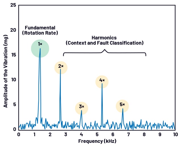 最后要談的是慣性檢測(cè)與AI分析的集成方案,集成的目的是在智慧農(nóng)業(yè)領(lǐng)域?qū)崿F(xiàn)預(yù)測(cè)性維護(hù)?,F(xiàn)代農(nóng)場(chǎng)規(guī)模不斷擴(kuò)大,因而不得不依賴高資本支出的機(jī)械進(jìn)行生產(chǎn)。此類設(shè)備不僅要精準(zhǔn)無(wú)誤地運(yùn)行,還必須經(jīng)受住季節(jié)性農(nóng)耕任務(wù)的惡劣環(huán)境和高強(qiáng)度作業(yè)的考驗(yàn)。在短暫的種植或收獲季節(jié)中,如果設(shè)備發(fā)生故障,可能會(huì)造成嚴(yán)重的經(jīng)濟(jì)損失。例如,播種機(jī)或收割機(jī)等精密設(shè)備,常常需要在風(fēng)雨、塵土、泥濘、碎石等惡劣環(huán)境下作業(yè)。在這些環(huán)境中,關(guān)鍵振動(dòng)特征的變化可用于提前預(yù)測(cè)設(shè)備問(wèn)題,然后在盡量不影響高峰期生產(chǎn)的時(shí)間內(nèi)進(jìn)行維護(hù)來(lái)解決問(wèn)題。機(jī)械振動(dòng)分析(類似于牲畜的生命體征監(jiān)測(cè))可用于精確定位機(jī)械元件中不同問(wèn)題的故障模式和時(shí)間,例如軸承故障、軸未對(duì)準(zhǔn)、不平衡、松動(dòng)、齒輪故障和其他問(wèn)題。假設(shè)軸承存在缺陷,如表面剝落或形狀偏離理想球體。每當(dāng)這類缺陷與機(jī)器表面接觸時(shí),都會(huì)在平臺(tái)上產(chǎn)生一個(gè)沖擊,從而引發(fā)復(fù)雜的振動(dòng)響應(yīng),其中既包含基頻成分,也包含寬帶成分。圖5以頻譜形式展示了一個(gè)復(fù)雜的振動(dòng)曲線。