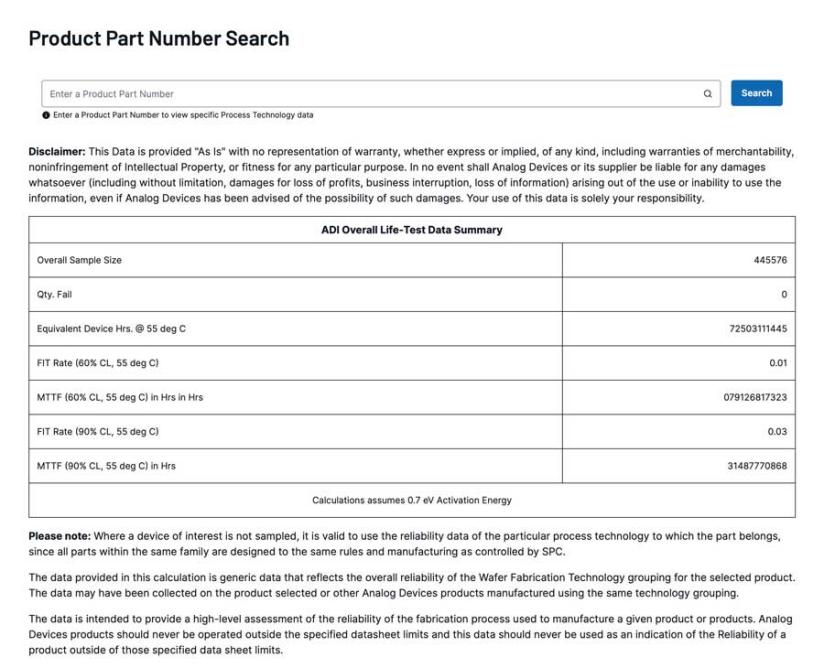 晶圓制造數(shù)據(jù)是analog.com上提供的可靠性數(shù)據(jù)和資源之一。點(diǎn)擊它就會(huì)呈現(xiàn)包括產(chǎn)品整體壽命測(cè)試數(shù)據(jù)摘要在內(nèi)的數(shù)據(jù)。它由總樣本數(shù)量、失效數(shù)量、55°C下等效器件小時(shí)數(shù)、FIT值(基于HTOL數(shù)據(jù))及MTTF數(shù)據(jù)(60%和90%置信度)組成。示例如圖3所示。