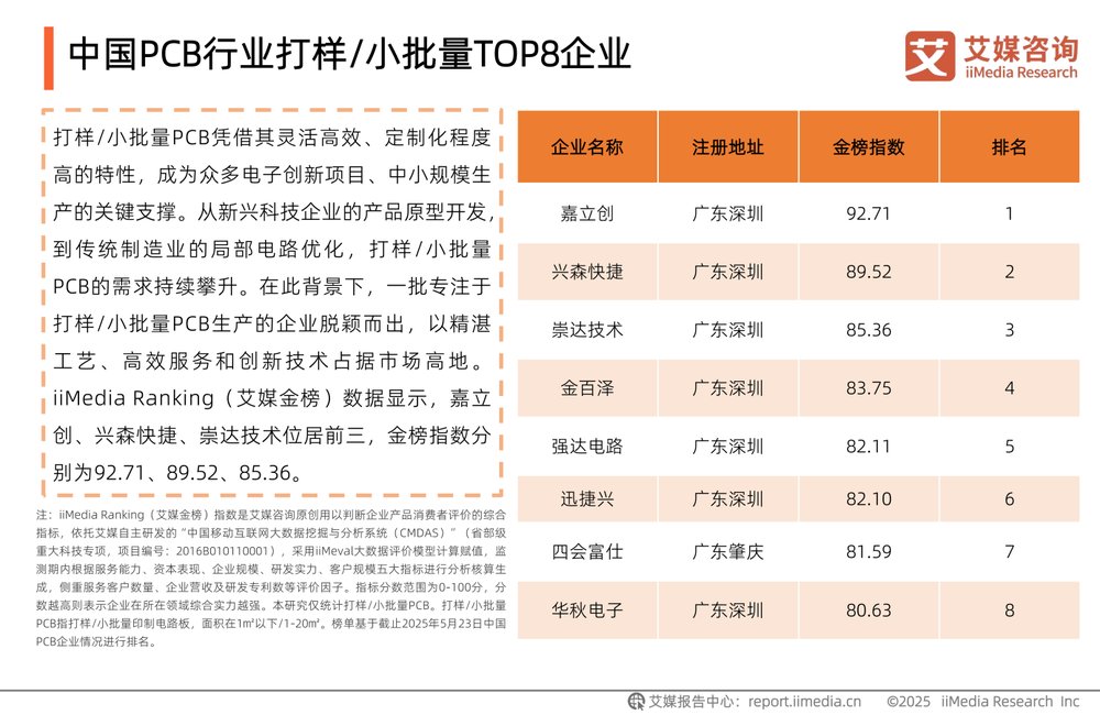 根據艾媒金榜(iiMedia Ranking)數據,中國PCB頭部企業(yè)已呈現明顯的“大批量”與“打樣/小批量”分化格局 。