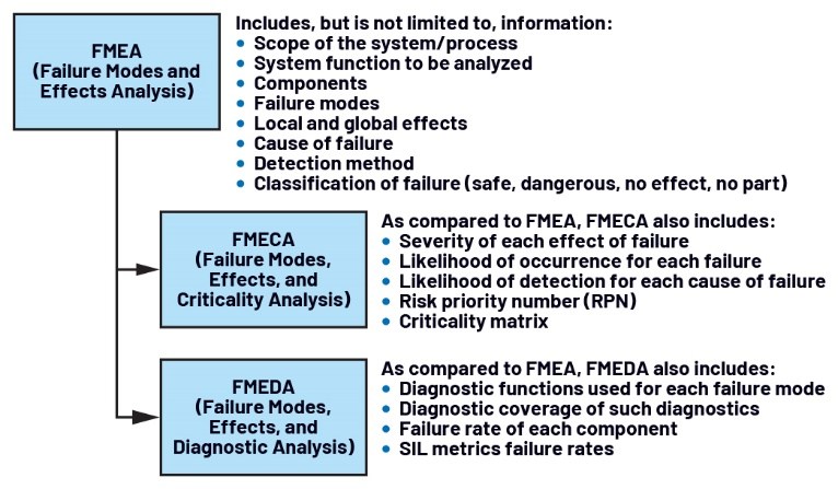 圖1展示了典型FMEA的構(gòu)成要素及其一些廣為人知的變體:FMECA和FMEDA。FMEA通常基于以下信息:系統(tǒng)或流程的相關(guān)信息、待分析的功能、組成系統(tǒng)的組件、每個(gè)組件的失效模式、局部及全局影響等。當(dāng)FMEA根據(jù)失效模式的重要性對其進(jìn)行優(yōu)先級排序時(shí),稱為失效模式、影響及危害性分析(FMECA)。當(dāng)FMEA采用某種度量方式來體現(xiàn)診斷功能的有效性時(shí),則稱為失效模式、影響及診斷分析(FMEDA)。1,2