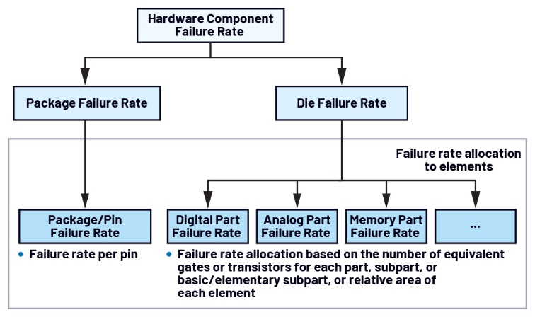 引腳FMEA是FMEA的一種,專注于分析IC封裝的潛在失效模式及其對系統(tǒng)功能的影響。引腳FMEA可以與計算出的封裝失效率(例如通過IEC 62380)配合使用,以確定IC的失效率分布,如圖1所示。失效率可以進(jìn)一步分為四種情況:安全、危險、無影響或無器件(即不涉及具體器件)。這種失效率認(rèn)定對于推導(dǎo)安全失效比率(SFF)和SRS危險失效概率至關(guān)重要。