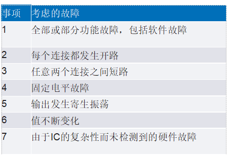 引腳FMEA顯示了這些假設(shè)的失效情況:固定電平故障(短接電源和短接到地)、開路或高阻抗、任意兩個相鄰連接之間短路(短接到相鄰引腳)。