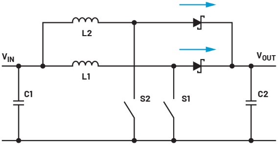 圖2.一種兩相升壓轉(zhuǎn)換器拓?fù)浣Y(jié)構(gòu),通過兩條路徑分配功率以提升轉(zhuǎn)換效率。