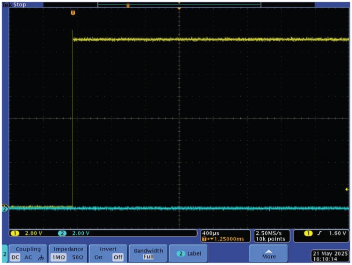 圖3顯示了施加10 V階躍時電路的響應。黃色曲線為輸入電壓,藍色曲線為輸出電壓。斷路閾值設置為12 V,因此輸入電壓幾乎沒有壓降地傳遞到輸出端。