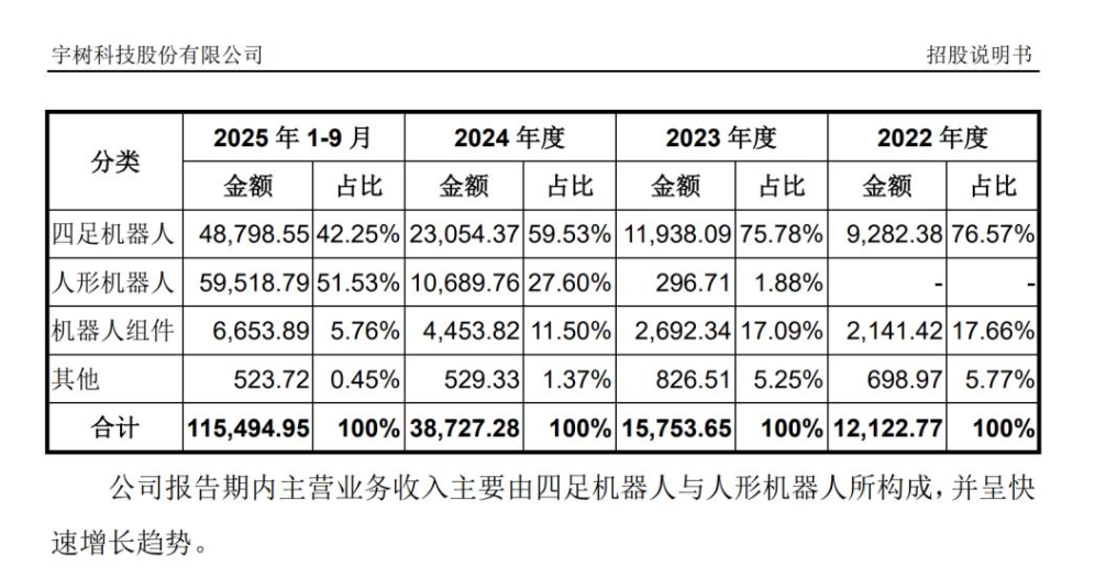 報告期內(nèi),宇樹科技主營業(yè)務(wù)收入由四足機(jī)器人與人形機(jī)器人所構(gòu)成。2022年、2023年、2024年以及2025年1—9月,四足機(jī)器人收入占比逐步下降,從76.57%降至42.25%,人形機(jī)器人收入占比逐步提升,從2023年占比1.88%,到2025年1—9月達(dá)到51.53%。
