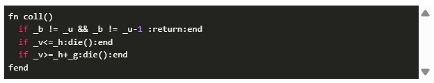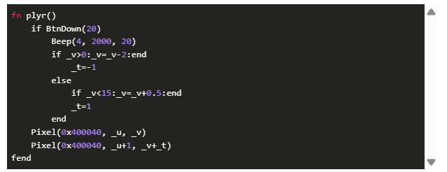 現(xiàn)在我們需要一個(gè)角色——那只小鳥!因?yàn)槲覀兪窃谔幚硐袼貓D像,所以必須發(fā)揮創(chuàng)意!我們的“小鳥”只有兩個(gè)對(duì)角線的像素。小鳥向上飛時(shí),右邊的像素會(huì)更高。如果小鳥在下降,那么右邊的像素就會(huì)更低。我們會(huì)根據(jù)按鍵操作和時(shí)間來(lái)改變速度變量 _v 。