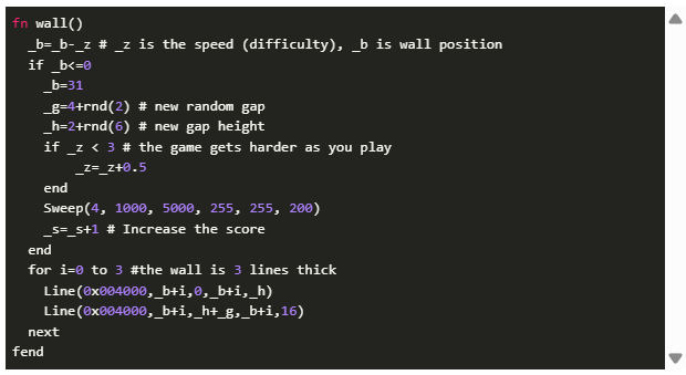 這個(gè)游戲需要有一堵橫跨整個(gè)屏幕的墻。我們將把這堵墻設(shè)置為三像素厚。每當(dāng)我們走到盡頭時(shí),就會(huì)開始建造新的一堵墻,并為這個(gè)新墻設(shè)定一個(gè)新的隨機(jī)間隙以及間隙的高度。我們還會(huì)使用掃掠功能來(lái)發(fā)出一點(diǎn)聲音。