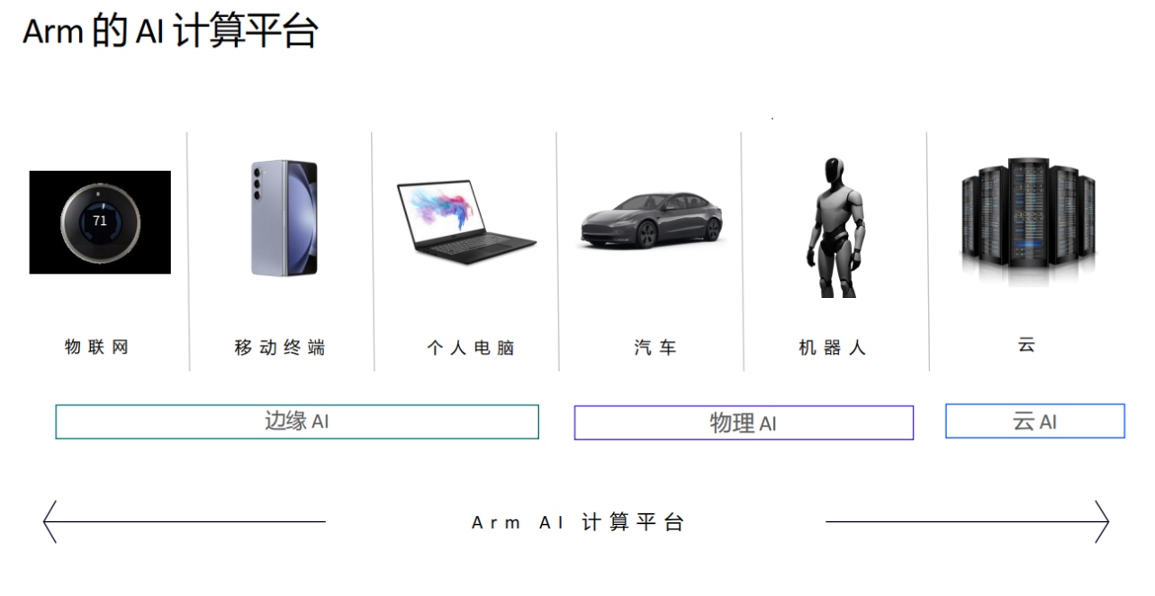 為支撐這一架構(gòu),Arm 構(gòu)建了覆蓋六大品類(lèi)的統(tǒng)一 AI 計(jì)算平臺(tái):物聯(lián)網(wǎng)設(shè)備、移動(dòng)終端、個(gè)人電腦、汽車(chē)、機(jī)器人以及云端。而從Arm分享的這一連續(xù)譜系中來(lái)看,物理 AI 正處于邊緣 AI 與云 AI 之間的關(guān)鍵銜接位置。通過(guò)這一平臺(tái),Arm 不僅實(shí)現(xiàn)了跨設(shè)備復(fù)用,還將高能效計(jì)算基因滲透到每個(gè)環(huán)節(jié)。而當(dāng)前全球 100% 聯(lián)網(wǎng)人群每日都在使用 Arm 技術(shù),這一規(guī)模效應(yīng)為物理 AI 生態(tài)提供了最堅(jiān)實(shí)的軟件與開(kāi)發(fā)者基礎(chǔ)。