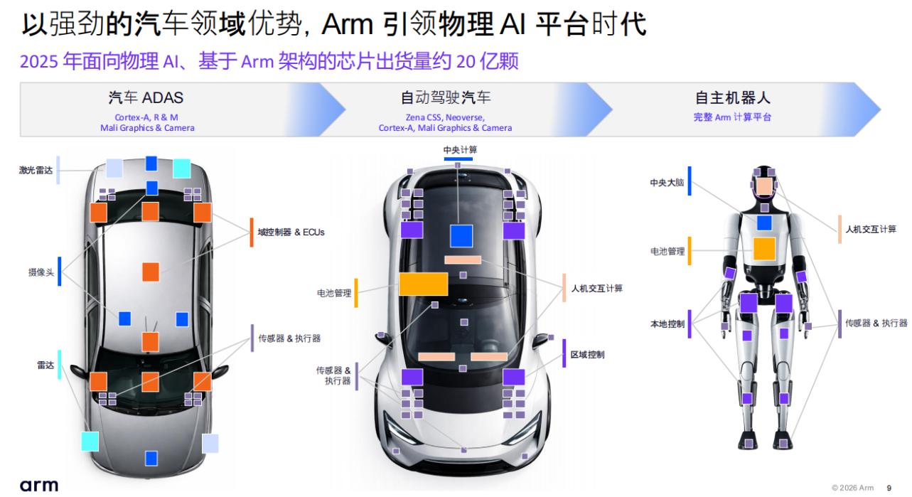 Arm 物理 AI 事業(yè)部執(zhí)行副總裁 Drew Henry 在近期中國(guó)媒體溝通會(huì)上系統(tǒng)拆解了這一賽道的底層邏輯。公司將物理 AI 定義為“將 AI 深度嵌入配備執(zhí)行器的自主運(yùn)動(dòng)設(shè)備”,其核心挑戰(zhàn)在于實(shí)現(xiàn)微秒至毫秒級(jí)的感知-決策-控制閉環(huán)。這一要求直接驅(qū)動(dòng)計(jì)算平臺(tái)從云端訓(xùn)練主導(dǎo)轉(zhuǎn)向端側(cè)實(shí)時(shí)執(zhí)行主導(dǎo)。憑借超 35 年高能效、高可靠計(jì)算技術(shù)基因,以及全球超 3250 億顆 Arm 架構(gòu)芯片出貨量、2200 萬(wàn)開(kāi)發(fā)者生態(tài),Arm 已將自身定位為跨越邊緣 AI、物理 AI 與云 AI 的統(tǒng)一平臺(tái)提供商。其中物理 AI 聚焦汽車(chē)與機(jī)器人兩大核心應(yīng)用,2025 年面向該領(lǐng)域的 Arm 架構(gòu)芯片出貨量已達(dá) 20 億顆,標(biāo)志著Arm從 ADAS 時(shí)代的技術(shù)積累向自主系統(tǒng)時(shí)代的全面躍遷。