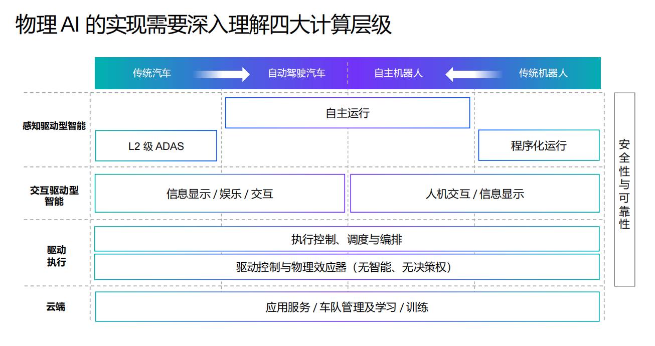 實(shí)現(xiàn)物理 AI 的核心在于深入理解四大計(jì)算層級(jí)。這一框架是 Arm 經(jīng)過(guò)多年 ADAS 與自主系統(tǒng)實(shí)踐提煉出的技術(shù)地圖,直接對(duì)應(yīng)傳統(tǒng)汽車(chē)向自動(dòng)駕駛轉(zhuǎn)型、固定功能機(jī)器人向自主機(jī)器人升級(jí)的兩大演進(jìn)路徑。