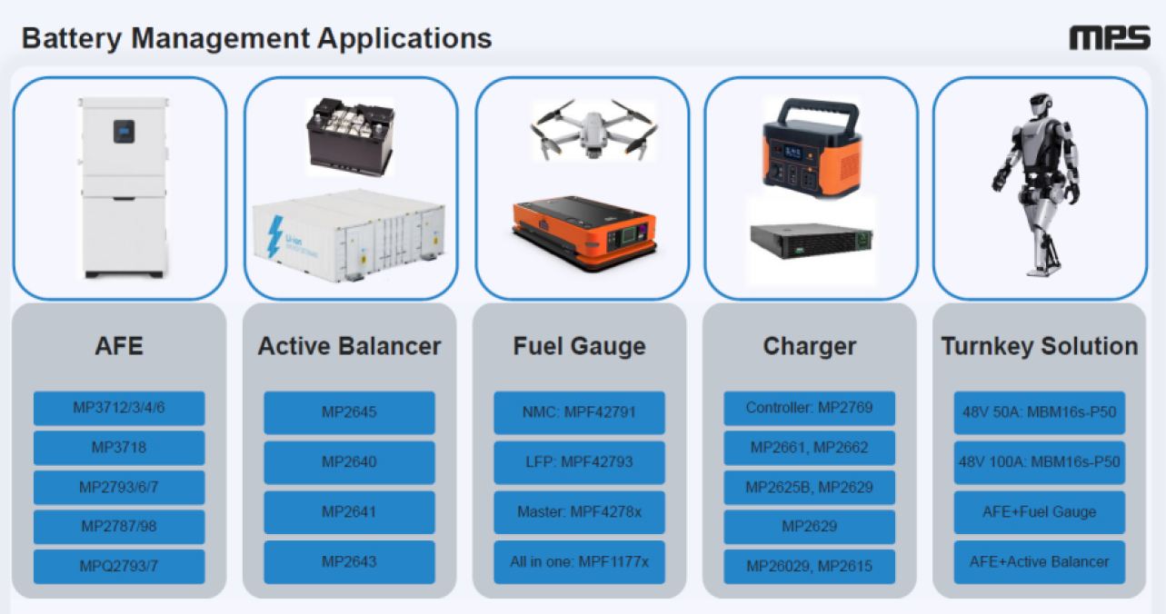 MPS在電池管理系統(tǒng)(BMS)領域已構建起較為完整且具有競爭力的產(chǎn)品布局,目前主要涵蓋五大類核心產(chǎn)品,覆蓋從信號采集到系統(tǒng)級解決方案的多個關鍵環(huán)節(jié)。