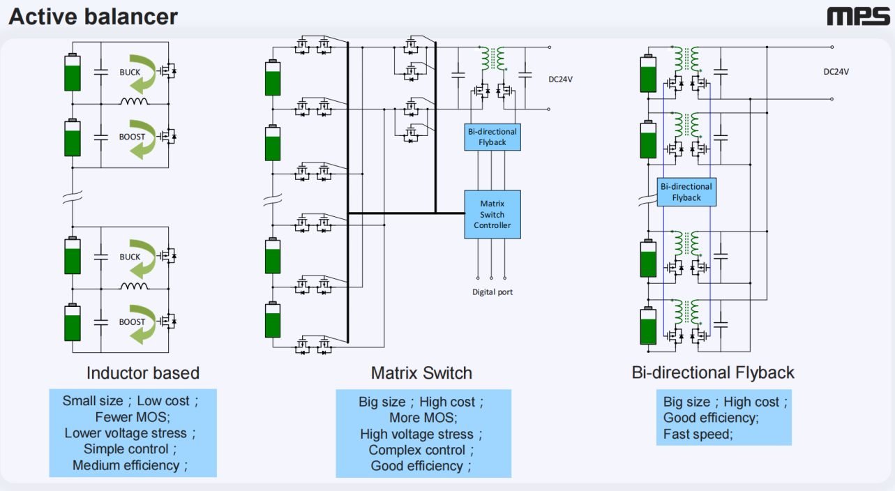 第一類方案——基于電感的相鄰式均衡,是MPS重點投入方向。該方案中MOS管僅需承受兩節(jié)電芯電壓,可充分利用MPS的集成工藝,將控制、診斷及冗余電路集成于IC內(nèi)部。通過高頻控制,電感體積可大幅縮小,且集成化有助于降低成本。隨著量產(chǎn)規(guī)模擴大與研發(fā)成本攤薄,該方案具備良好發(fā)展前景??傮w而言,主動均衡技術仍需在可靠性、成本與體積三方面持續(xù)優(yōu)化。
