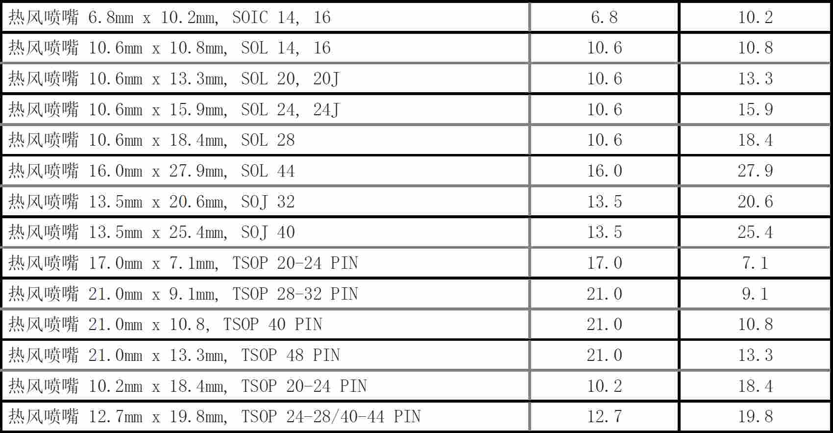 3.長方形風嘴,出風方向為兩邊出風,主要用來拆焊SOIC、TSOP封裝類型的芯片,其規(guī)格尺寸如下圖所示: