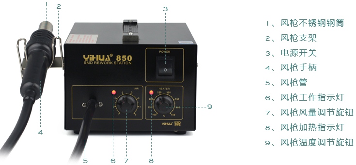 下面以誼華品牌的850型號的熱風槍為例,展示了熱風槍結構的主要組成部分,如下圖