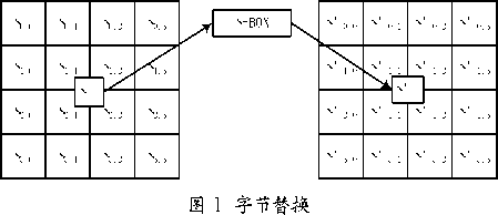 AES算法的基本運(yùn)算是字節(jié)替換(SubBytes),也就是對State中的每個字節(jié)經(jīng)過S-BOX查表轉(zhuǎn)換。其具體的操作為對于4X4狀態(tài)矩陣中每個16進(jìn)制的字節(jié),前4b標(biāo)示為x,后4b標(biāo)示為y,坐標(biāo)(X,)所確定的數(shù)即為字節(jié)替換的結(jié)果。圖1所示是AES算法的字節(jié)替換圖。