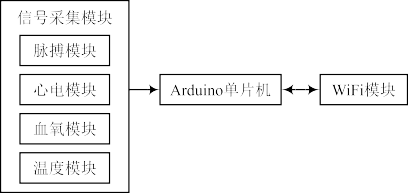 (1)信號(hào)采集模塊由心電、脈搏、血氧、溫度傳感器組成,用于測(cè)量人體生理參數(shù)。
