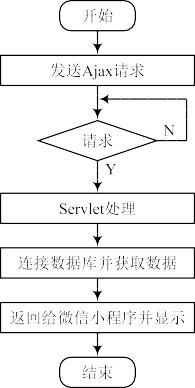 設(shè)計(jì)過(guò)程 :安裝 ODBC 驅(qū)動(dòng),使得電腦能夠遠(yuǎn)程連接服務(wù)器端的數(shù)據(jù)庫(kù),在 LabVIEW 中使用庫(kù)鏈接工具包LabSQL,配置主機(jī)的 IP 及數(shù)據(jù)庫(kù)的用戶(hù)名和密碼,成功連接后,在前面板中寫(xiě)入插入的 SQL 語(yǔ)句,在 LabVIEW 中進(jìn)行格式轉(zhuǎn)換,使得 LabVIEW 中的數(shù)據(jù)能夠源源不斷地插入到數(shù)據(jù)庫(kù)中。在小程序端發(fā)送 Ajax 請(qǐng)求,服務(wù)器接收到請(qǐng)求后,使用 JDBC 驅(qū)動(dòng)連接服務(wù)器上的 MySQL 數(shù)據(jù)庫(kù),通過(guò)執(zhí)行 SQL 語(yǔ)句獲取數(shù)據(jù)庫(kù)最新數(shù)據(jù),并將其轉(zhuǎn)存為 Json格式,返回給小程序端,在小程序得到數(shù)據(jù)后,將其展示到頁(yè)面上。程序流程如圖 6 所示。