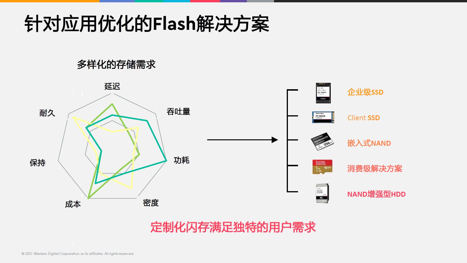 即使是同一代閃存,針對(duì)不同的應(yīng)用場(chǎng)景,也會(huì)有不同的取舍和優(yōu)化。西部數(shù)據(jù)擁有自己的閃存制造工廠,可以根據(jù)所生產(chǎn)的閃存顆粒,針對(duì)不同應(yīng)用來(lái)優(yōu)化閃存性能。比如,有的場(chǎng)景需要低功耗,有的需要高性能,有的需要低價(jià)格,有的需要耐擦寫(xiě)次數(shù)更強(qiáng)等等,這些性能很難集中體現(xiàn)在一個(gè)產(chǎn)品上。