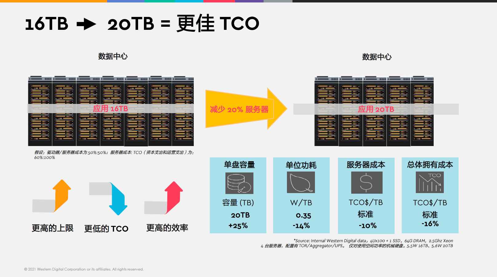 根據(jù)劉鋼的介紹,新品單盤(pán)容量密度的提高,可保證用戶(hù)在同等容量的情況下,少部署20%的服務(wù)器?!霸陉P(guān)鍵部件供應(yīng)如此緊張的當(dāng)下,減少20%服務(wù)器框架,也為企業(yè)降低了供應(yīng)壓力。如果結(jié)合計(jì)算CAPEX(資本性支出)和OPEX(企業(yè)的管理),用戶(hù)的TCO(總擁有成本)能降低16%。僅從16TB遷移到20TB,就能為數(shù)據(jù)中心用戶(hù)帶來(lái)上述優(yōu)勢(shì)?!?/span>
