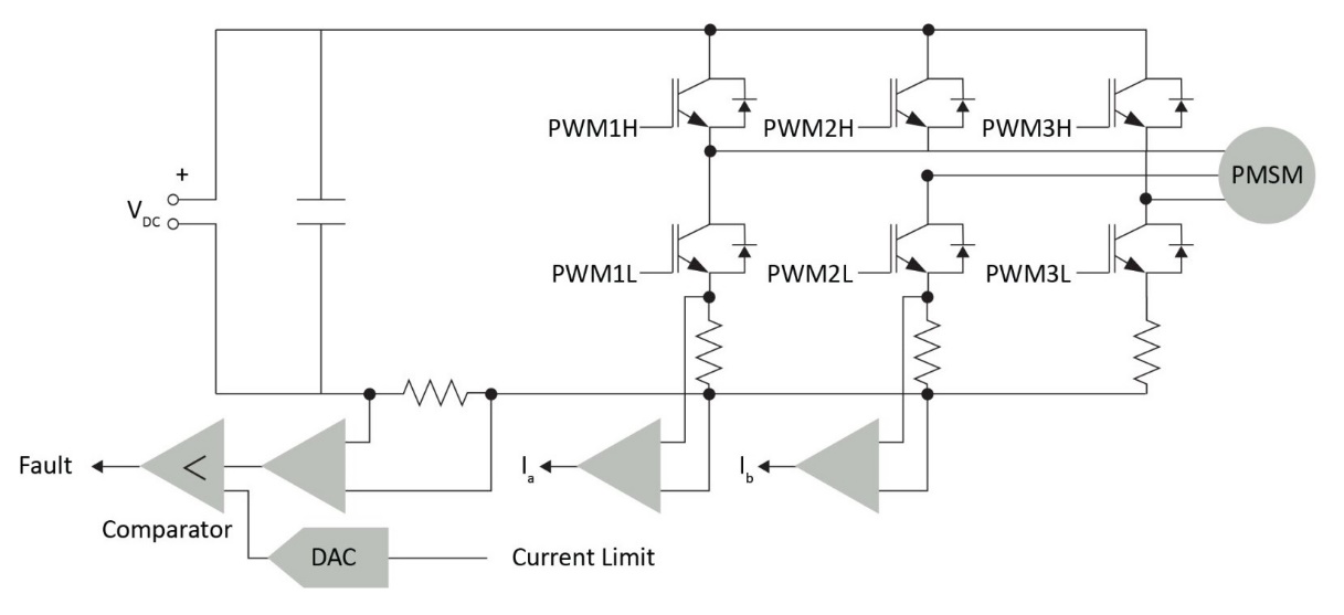 但是,要實(shí)現(xiàn)使用PMSM的優(yōu)勢(shì),需要了解實(shí)現(xiàn)高級(jí)FOC電機(jī)控制技術(shù)時(shí)固有的硬件復(fù)雜性,同時(shí)還需要掌握這一領(lǐng)域的專業(yè)知識(shí)。圖1給出了使用三相電壓源逆變器的三相無(wú)傳感器PMSM控制系統(tǒng)??刂颇孀兤餍枰龑?duì)相互關(guān)聯(lián)的高分辨率PWM信號(hào),以及大量需要信號(hào)調(diào)理的模擬反饋信號(hào)。此系統(tǒng)還需要硬件保護(hù)功能來(lái)實(shí)現(xiàn)容錯(cuò),同時(shí)利用高速模擬比較器實(shí)現(xiàn)了快速響應(yīng)。實(shí)現(xiàn)傳感、控制和保護(hù)所需的這些額外模擬元件增加了解決方案的成本,而典型的BDC電機(jī)設(shè)計(jì)或簡(jiǎn)單的ACIM每赫茲電壓(V/F)控制并不需要這些元件。