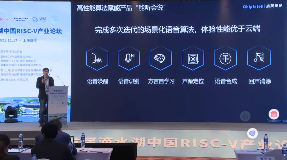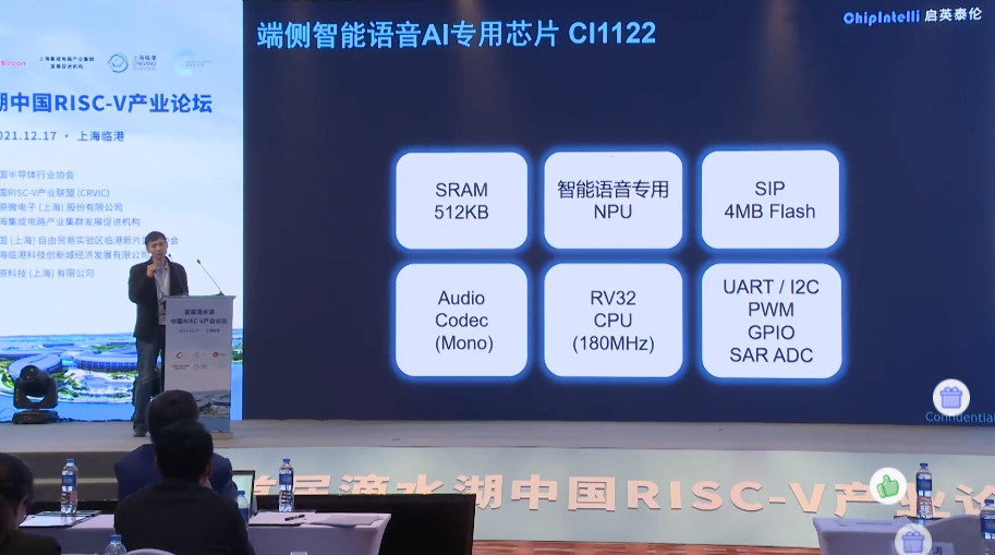 2021年12月17日,在中國RISC-V產(chǎn)業(yè)聯(lián)盟、芯原微電子和上海集成電路產(chǎn)業(yè)集群發(fā)展促進(jìn)機(jī)構(gòu)共同主辦的首屆“滴水湖中國RISC-V產(chǎn)業(yè)論壇”上,成都啟英泰倫科技有限公司副總裁張來分享了其最新的語音處理的人工智能芯片產(chǎn)品——CI1122。該產(chǎn)品采用內(nèi)置RISC-V處理器,搭載了其自主研發(fā)的腦神經(jīng)網(wǎng)絡(luò)處理器BNPU,專門面向端側(cè)智能語音應(yīng)用。