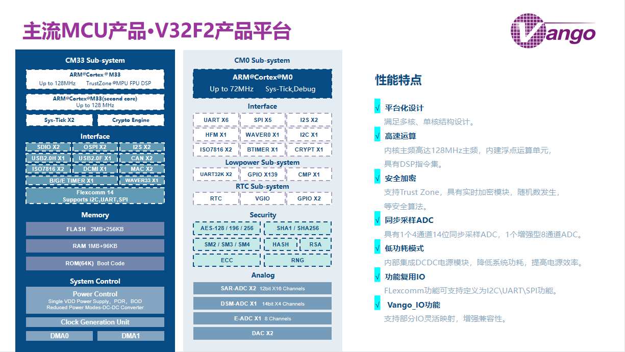 V32F2系列芯片是基于泰山400內(nèi)核(兼容ARM Cortex-M33)設(shè)計,平臺支持雙核和單核架構(gòu),主頻不低于120MHz,內(nèi)建浮點單元(FPU)和內(nèi)存保護單元(MPU),具有DSP指令集,支持各種常用功耗模式,是一款高性能多用途的通用型MCU,同時具備以下特點: